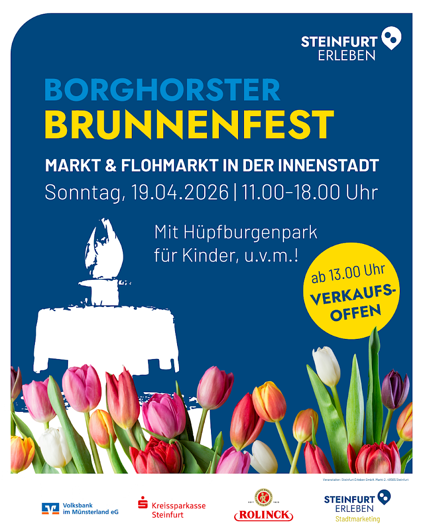 Jedes Jahr im April, läutet das Brunnenfest den Startschuss der Steinfurter Marktsaison ein. Der Frühling steht in voller Blüte, Mensch und Tier wollen endlich wieder "Draußenzeit" genießen. Frisch herausgeputzt, freut sich die Borghorster Innenstadt über viele Besucherinnen und Besucher. Über 40 Händlerstände und ein Flohmarkt mit rund 75 Ständen bieten ein Interessantes Angebot zum stöbern und Schnäppchen machen. Der Einzelhandel lädt Sie herzlich zum verkaufsoffenen Sonntag ein und die Gastronomie tut etwas für Ihre Gaumenfreude. Seien Sie herzlich willkommen zum Borghorster Brunnenfest!